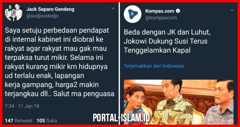 Saya baiklah perbedaan pendapat di internal kabinet ini diobral ke rakyat supaya rakyat mau gak mau terpaksa turut mikir. Selama ini rakyat kurang mikir krn hidupnya ud terlalu enak, lapangan kerja gampang, harga2 makin terjangkau dll.. Salut ma penguasa https://t.co/z2SV6KBVDI— Jack Separo Gendeng (@sudjiwotedjo) 11 Januari 2018