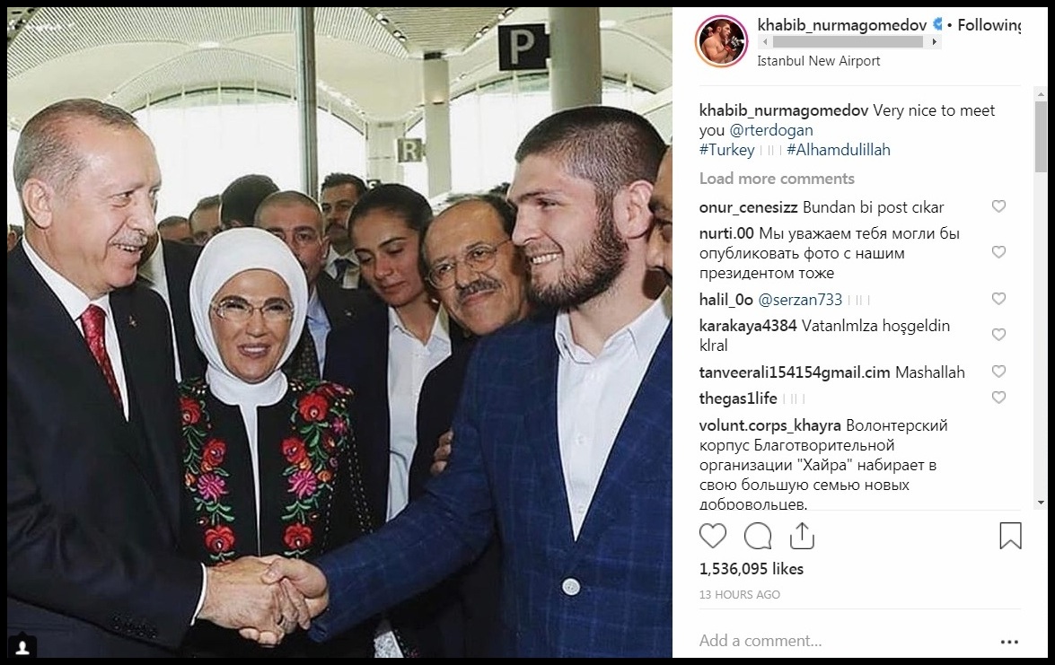 #Turkey 🇹🇷 #Alhamdulillah," tulis Khabib di caption foto salaman dengan Erdogan yang diunggah di akun IG-nya.
