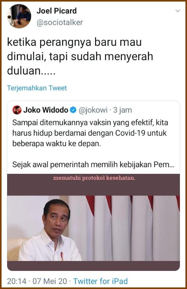 Sejak awal pemerintah menyepelekan covid-19, hingga akhirnya kita disuruh berdamai dengannya... 😰https://t.co/Pti7BvBjko— WNI Asli (@asli_wni) May 7, 2020