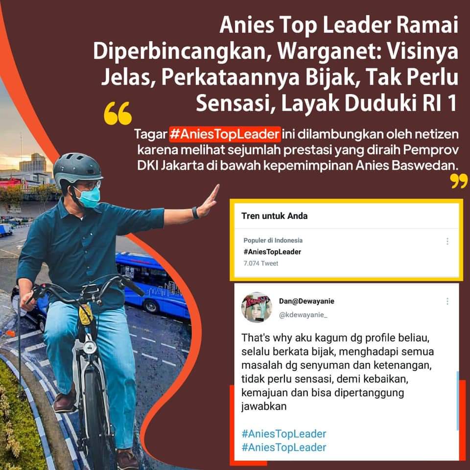 Tagar #AniesTopLeader ini dilambungkan oleh netizen karena melihat sejumlah prestasi yang diraih Pemprov DKI Jakarta di bawah kepemimpinan Anies Baswedan.