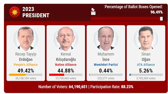 Statistik resmi menunjukkan bahwa Erdogan memenangkan 49,4% suara sementara Kilicdaroglu memenangkan 44,9%.
